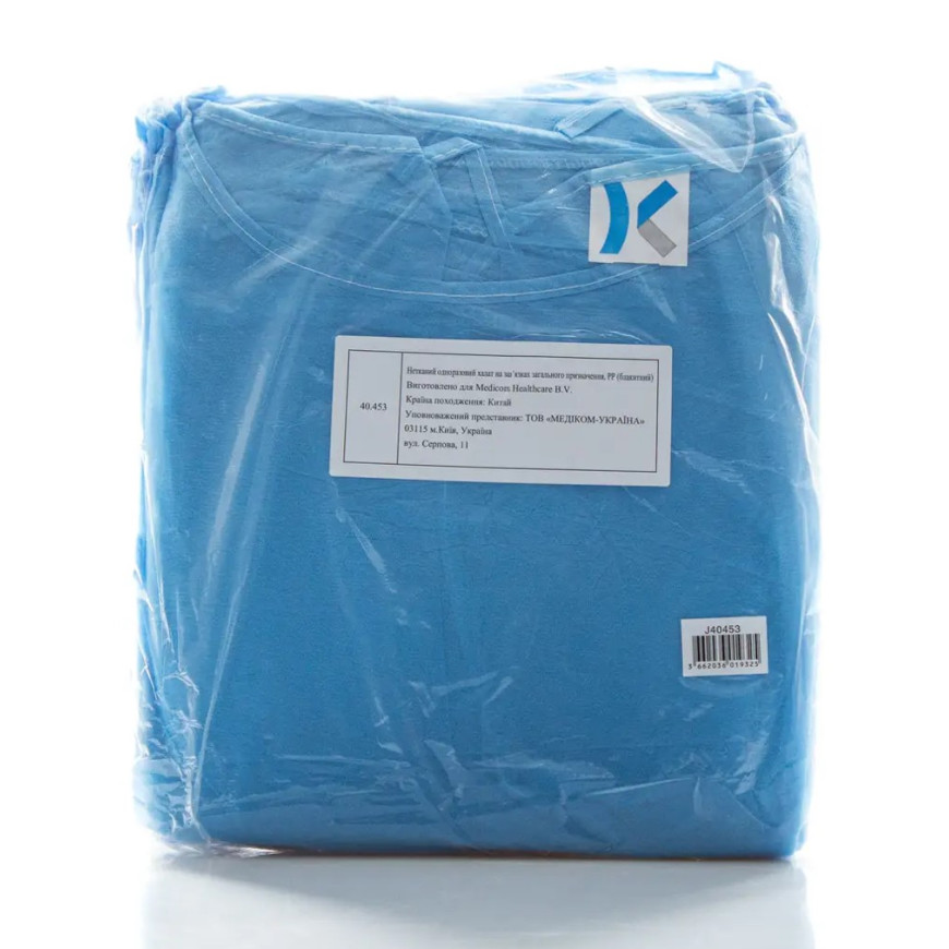 Одноразовий нетканий халат на зав’язках загального призначення виготовлений із високоякісного поліпропілену (РР) блакитного кольору 10 шт. Призначений для захисту одягу та зниження ризику забруднення під час виконання різних робіт у медичній, харчовій, косметологічній, лабораторній чи побутовій сферах.